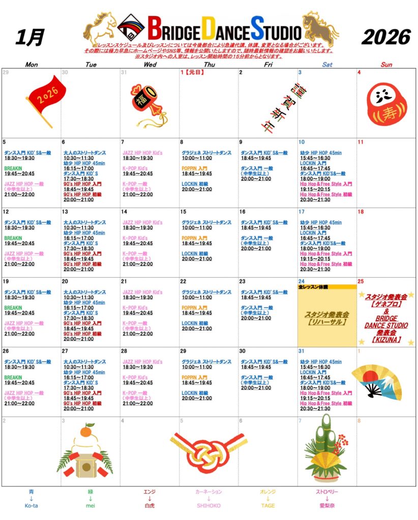 また、レッスンスケジュール及びレッスンについては今後都合により急遽代講、休講、変更となる場合がございます。